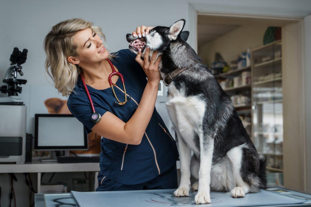 A vet performs wellness care on a German Shepherd
